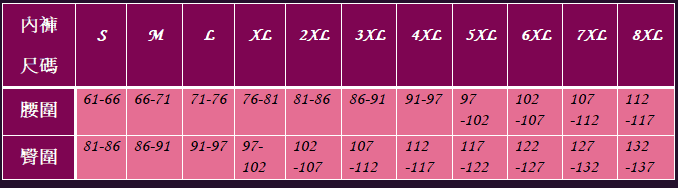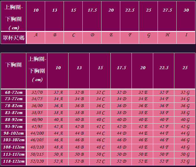 注意: 尺碼表只供參考,貨物實際大小可能會有1-3 cm誤差